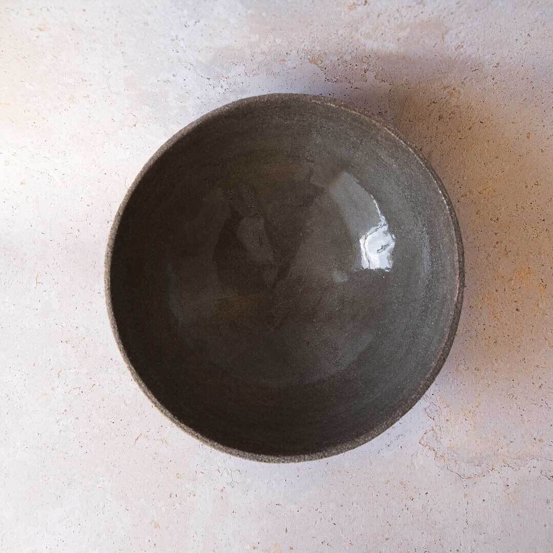 Bol/ensaladera de arcilla refractaria chamotada de color gris piedra, esmaltado brillante en el interior. Apto para uso alimentario, por lo que se puede utilizar tanto para decoración cómo para bol / ensaladera. Medidas 23cm diámetro por 12cm. alto.