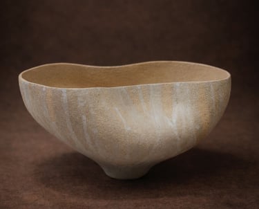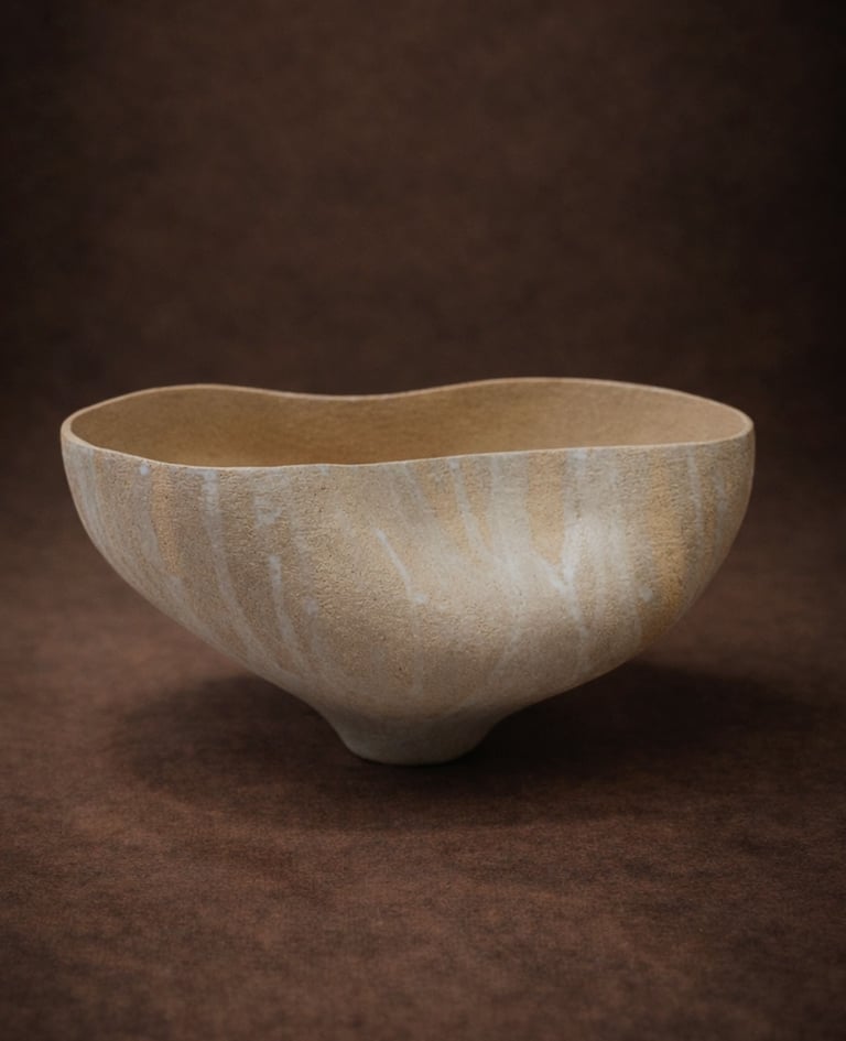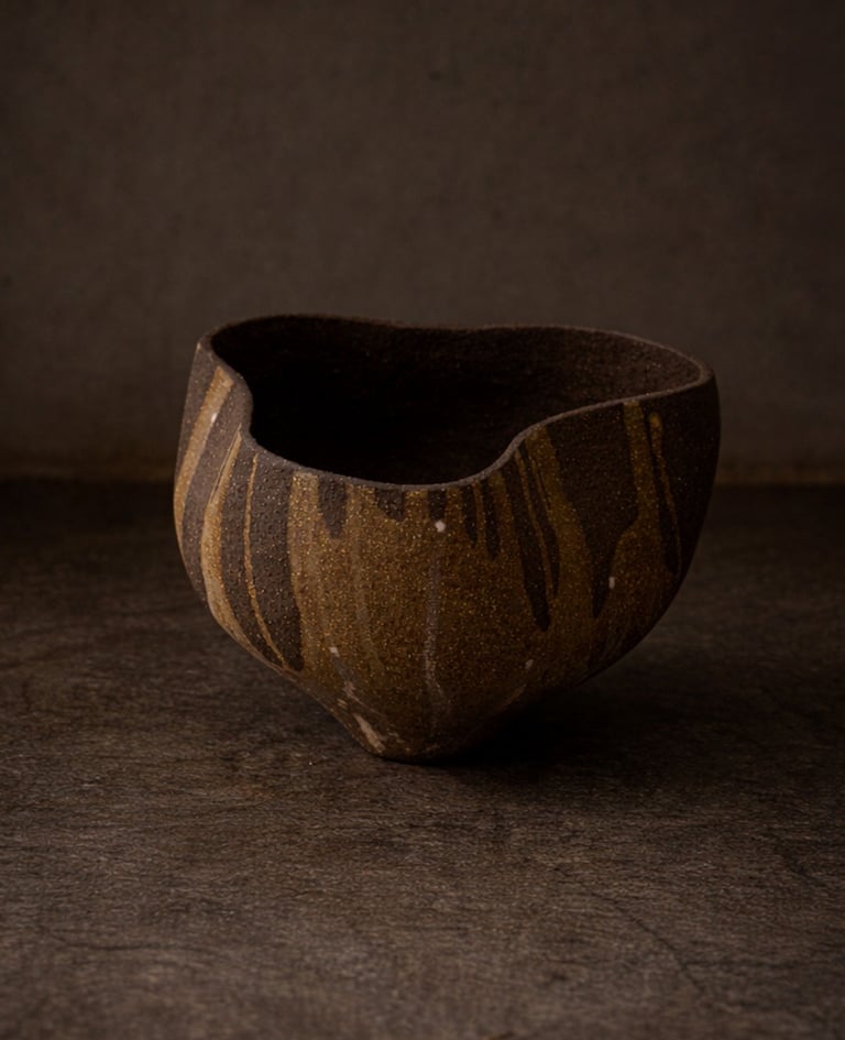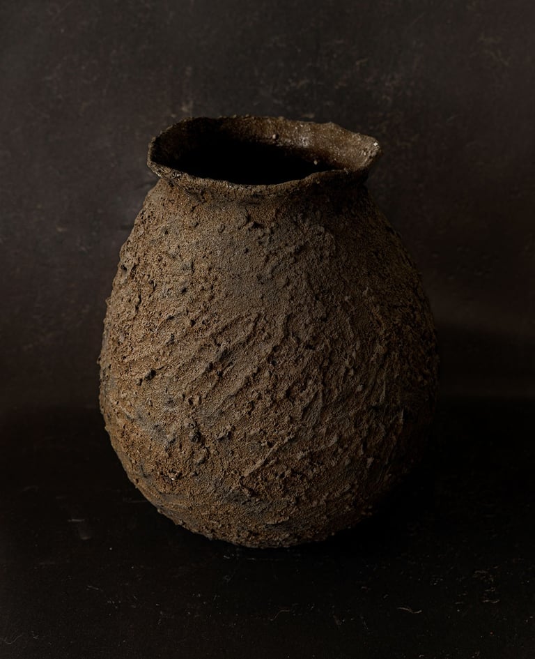Modelado a mano en arcilla refractaria chamotada, dejando la textura del barro como protagonista. El esmaltado invertido cae en el exterior como un trazo de raíces: una huella orgánica una huella orgánica y sobria que convierte cada pieza en una obra singular