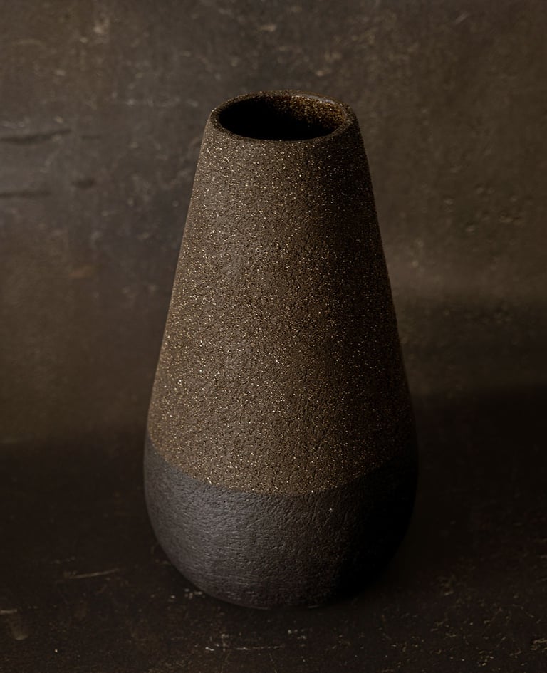 Modelado a mano en arcilla refractaria chamotada negra. La base, esmaltada en negro mate, ancla la pieza; el cuerpo superior deja la chamota expuesta y trabajada para potenciar la textura. Una forma esbelta y minimalista que juega con el contraste entre negros y acabados, sobria y elegante.